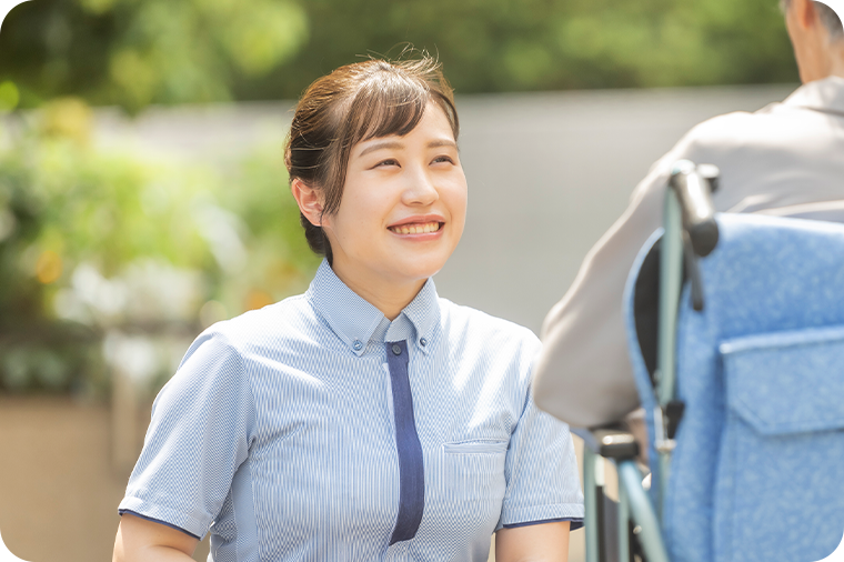 実践に裏付けられた確かな技術。そして、ご本⼈やご家族と深く⼼を通わせられる⼈間⼒をもったスタッフがいます。国の基準を上回る⼿厚い⼈員配置で、お⼀⼈おひとりと向き合い、⼼をもって寄りそいます。